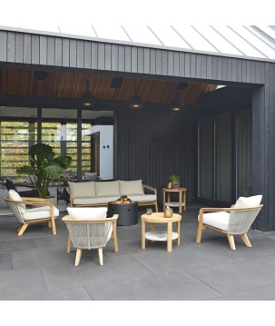 Le bois de teck cultivé et durable  se combine à merveille avec des cordes naturelles pour créer une collection vraiment spéciale de mobilier d'extérieur, parfaite pour les terrasses et les patios de jardin.