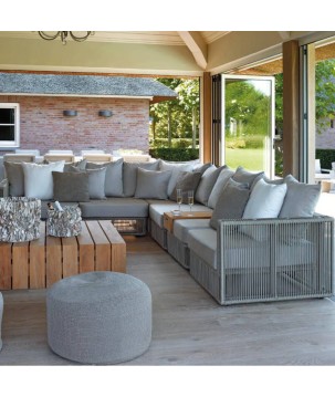 Pour encore plus de confort, les sièges sont équipés de coussins Sunbrella. Les sièges tels que le coin, le centre, la chaise longue et l'îlot sont dotés de coussins Sunbrella résistants aux intempéries pour que vous puissiez les laisser dehors en toutes saisons.