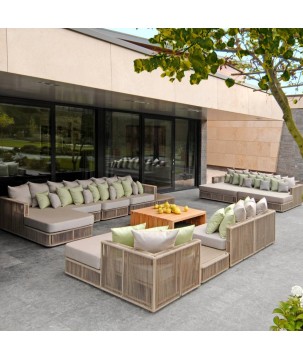 Pour encore plus de confort, les sièges sont équipés de coussins Sunbrella. Les sièges tels que le coin, le centre, la chaise longue et l'îlot sont dotés de coussins Sunbrella résistants aux intempéries pour que vous puissiez les laisser dehors en toutes saisons.