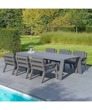 La collection comprend des chaises, des chaises basses de salle à manger, des fauteuils bas, des canapés bas, des bains de soleil, des tables assorties et des accessoires. L'aluminium a le grand avantage de nécessiter peu d'entretien et d'être très simple d'utilisation. Les coussins Sunbrella offrent un confort supplémentaire et, pour les produits lounge, ces coussins sont résistants aux intempéries.