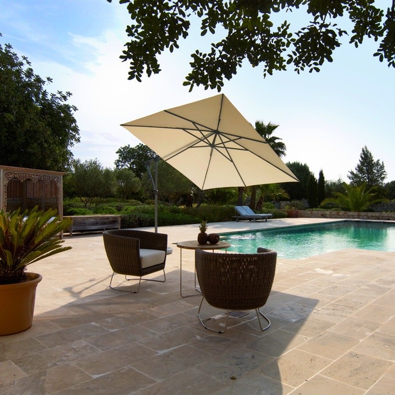 Ce parasol dont l'armature est en aluminium s'ouvre et s'incline à 45° grâce à ses manivelles. Une impression de légèreté se dégage car le tissu est comme suspendu au dessus de vous