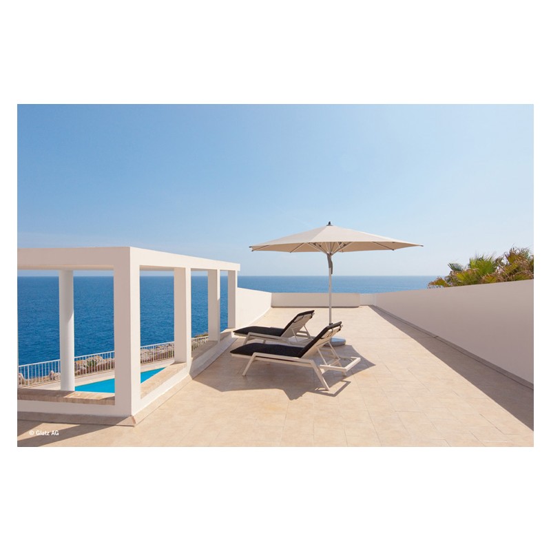 Ce parasol à mât central de taille intermédiaire est une référence auprès des restaurateurs. Résistant, durable et sûr.